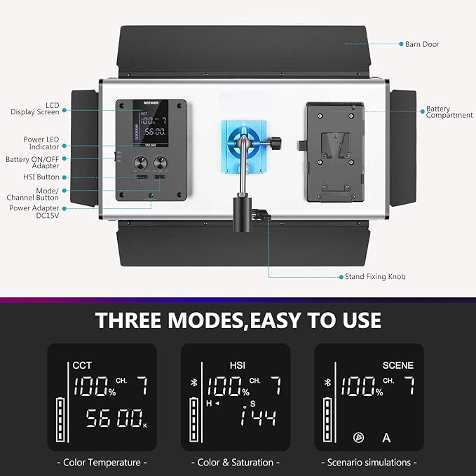 - APP INTELLIGENT CONTROL SYSTEM:You can set the channel (1-8/ALL), adjust the color temperature/brightness/HSI parameters/Scenes through the button and knob on the panel with clear LCD screen or by downloading “NEEWER” APP in such as Apple Store/Google play, etc through your smart mobile device (Android 4.3 or IOS 11.1 or above) for easy operation (Please Make sure the Bluetooth signal shows up on the LCD screen); 2 sets of parameters can be saved